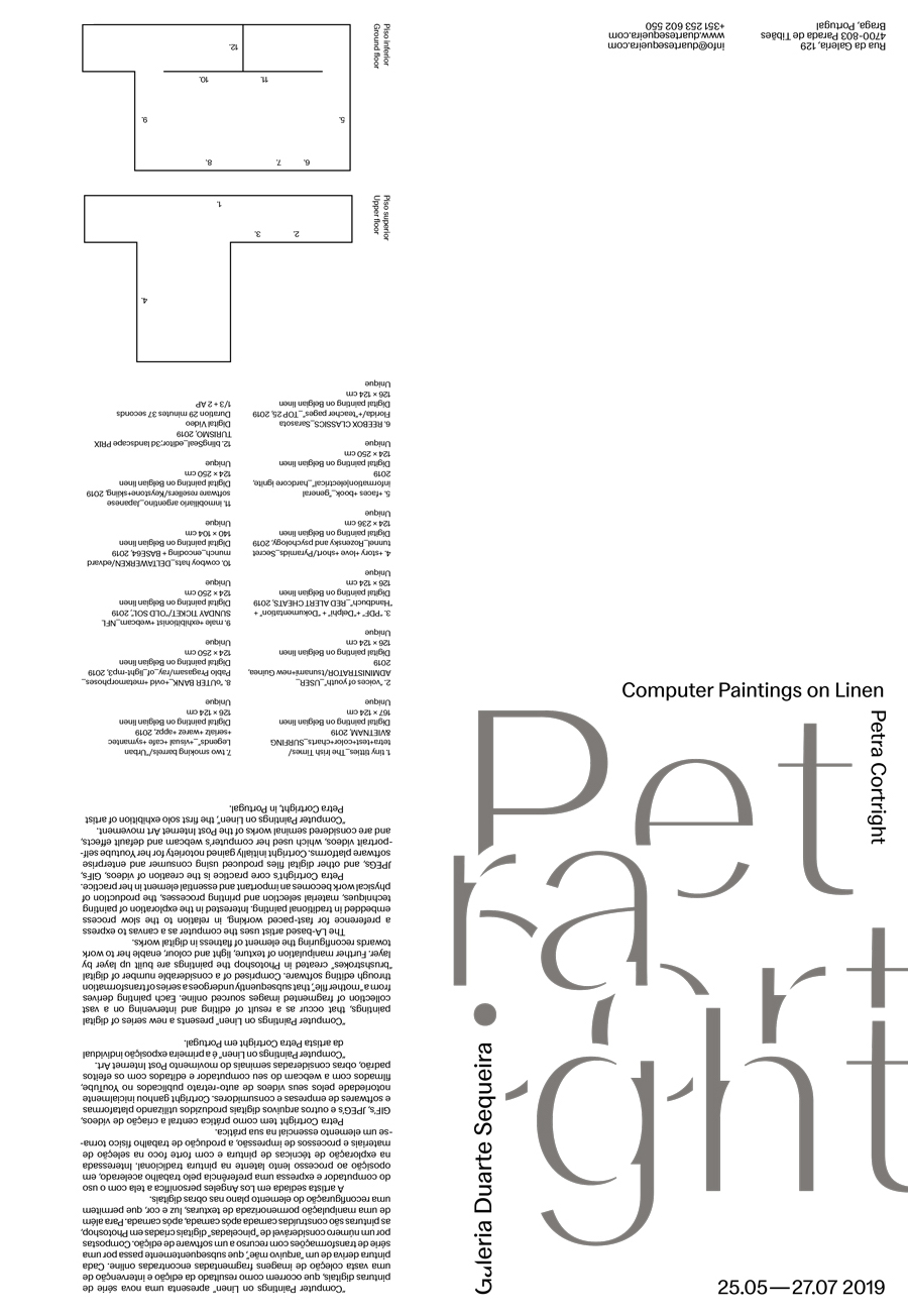 Poster folded brochure for “Computer Paintings on Linen”, the first solo exhibition of the LA-based artist Petra Cortright in Portugal, helded at Galeria Duarte Sequeira.